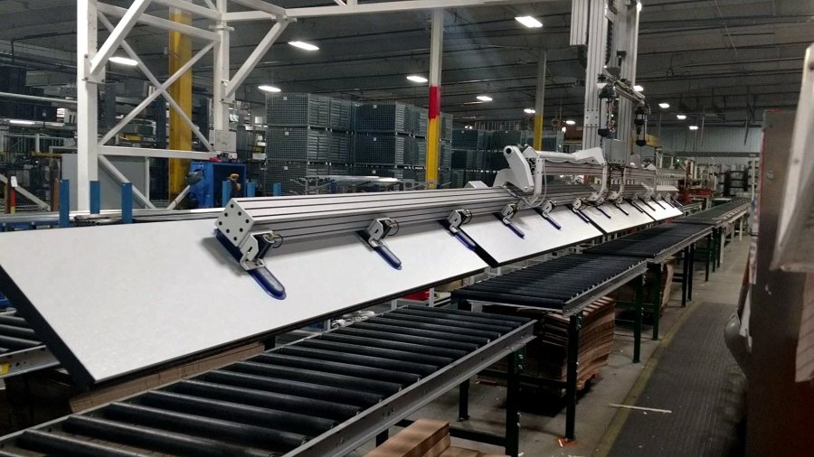Custom Design and Manufacture of Material Handling Automated Systems. This particular system is comprised of two manipulators mounted to a 70 foot overhead structure. One manipulator is a vacuum end-effector, one is a pneumatic gripper. This system handles 40 foot component parts.